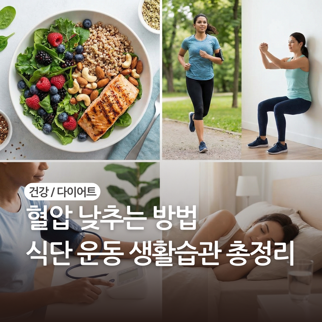 혈압 낮추는 법은 결코 특별한 비책이 있는 것이 아닙니다. DASH 식단으로 식탁을 바꾸고, 매일 30분 걷기와 주 3회 벽 스쿼트를 실천하며, 충분한 잠을 자는 것. 이 세 가지만 지켜도 대부분의 초기 고혈압은 조절이 가능합니다.
